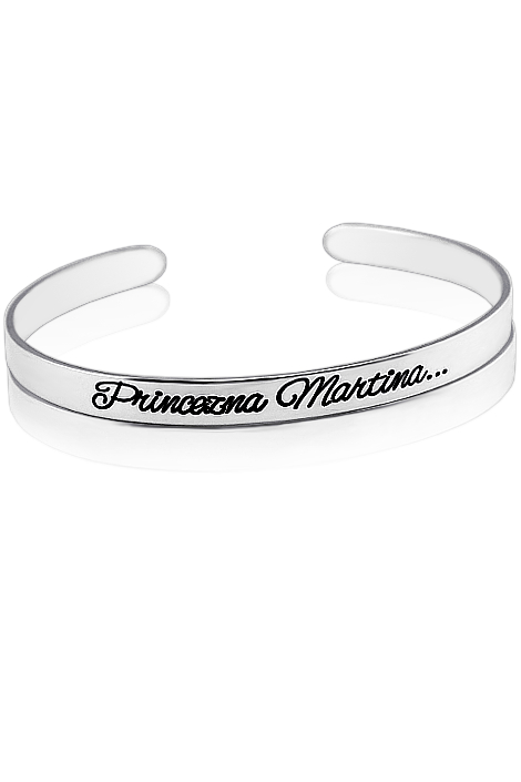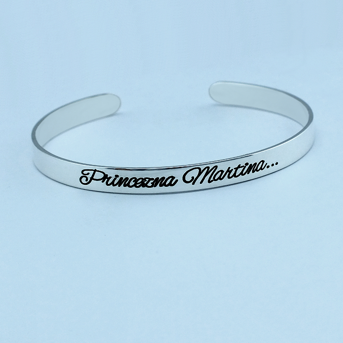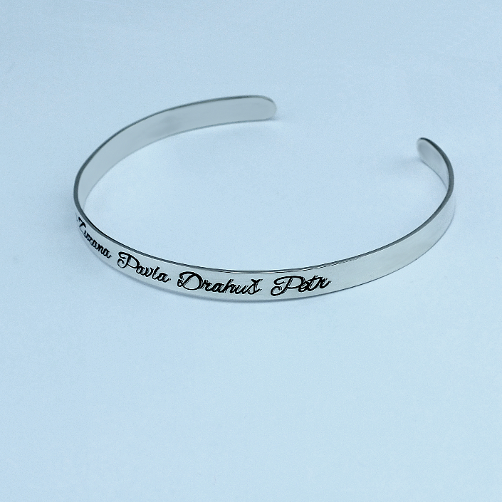 Stříbrný kruhový náramek zdobený vlastním rytím. Dámský náramek je vyrobený ze stříbra ryzosti 925/1000 v lesklé povrchové úpravě. Rytí na náramek je zcela na vás, na fotografii je pouze ilustrativní vzor. Veškeré rytí je už zahrnuto v ceně přívěsku. Požadovanou rytinu na dámský náramek nám napište do poznámky v objednávce ( třetí krok v košíku ).