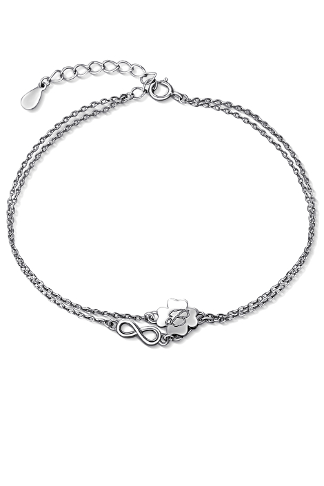 Dámský stříbrný náramek s čtyřlístkem a znakem nekonečna v lesklé povrchové úpravě. Na hladký čtyřlístek lze vyrýt písmenko nebo iniciál ( rytí už je v ceně náramku ). Délka náramku se znakem nekonečna je 18 cm (běžná dámská velikost). Do poznámky v objednávce nám napište jaké budete chtít rytí na kolečko (třetí krok v košíku).