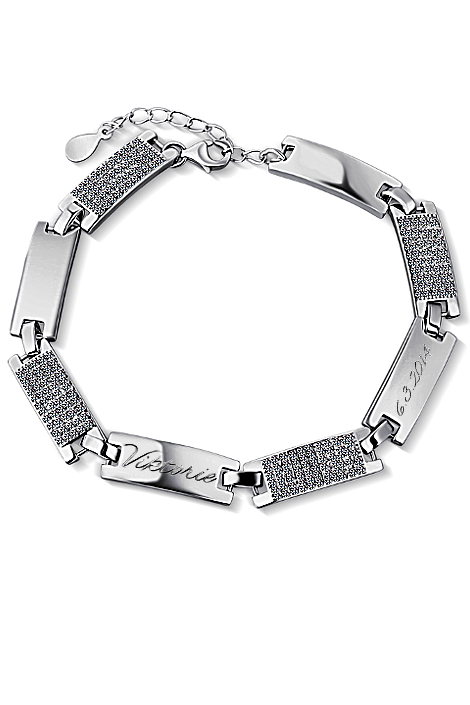 Dámský stříbrný náramek s destičkami v lesklé povrchové úpravě ryzosti 925/1000. Na hladké destičky lze vyrýt datum, jméno nebo vaše věnování (rytí už je v ceně náramku). Délka stříbrného náramku je nastavitelná 18cm až 20cm (běžná dámská velikost). Do poznámky v objednávce nám napište jaké budete chtít rytí na destičky (třetí krok v košíku).