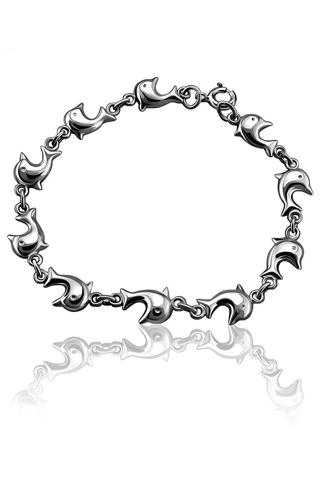 Stříbrný náramek s delfínky v lesklé povrchové úpravě. Náramek je vyroben ze stříbra ryzosit 925/1000 se zapínáním na pérový kroužek. Šířka náramku je 7 mm a délka 18 cm.