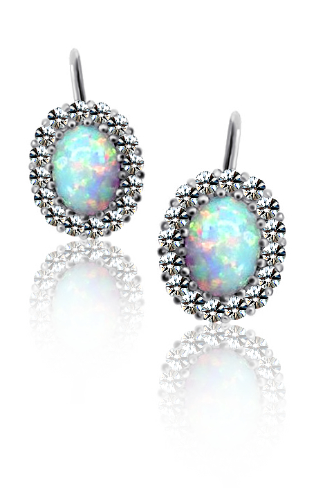 Zlaté náušnice jsou vyrobeny z bílého zlata ryzosti 14 karátů 585/1000. Zlaté náušnice jsou osazeny krásným bílým opálem oválného tvaru. Okolo oválného opálu jsou zasazeny bílé zirkony. Náušnice mají klasický dámský uzávěr na klapku.