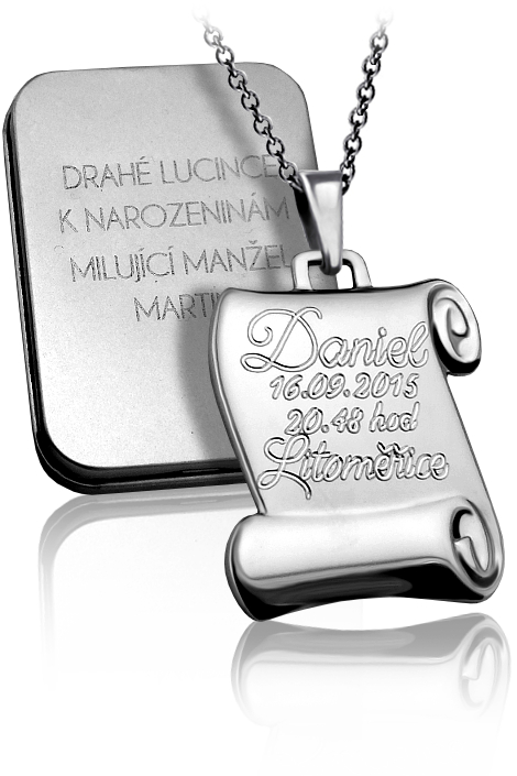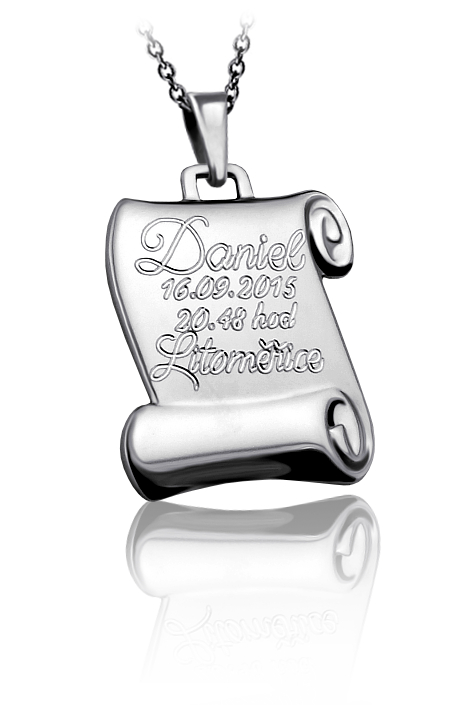 Řetízek a pergamen jsou vyrobeny ze stříbra ryzoti 925/1000 v lesklé povrchové úpravě. Řetízek je zdobený stříbrným pergamenem a vaším rytím. Rytí na pergamen a krabičku je zcela na vás, na fotografii je pouze ilustrativní vzor. Zapínaní řetízku je na pérový kroužek a délka je 50 cm (dostatečná délka i pro muže). V ceně náhrdelníku je již zahrnuta dárková krabička, na kterou můžeme vyrýt delší věnování. Požadované rytí na krabičku a pergamen, popřípadě jinou délku řetízku nám napište do poznámky v objednávce (třetí krok objednávky v košíku).
