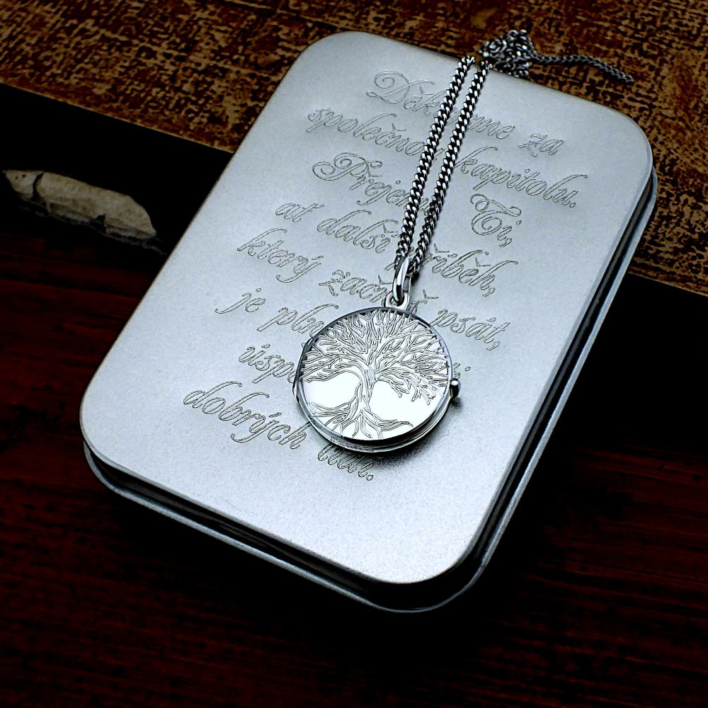 Řetízek a medailonek jsou vyrobeny ze stříbra ryzoti 925/1000 v lesklé povrchové úpravě. Řetízek je zdobený stříbrným otevíracím medailonkem a vaším rytím. Rytí na medailonek a krabičku je zcela na vás, na fotografii je pouze ilustrativní vzor. Zapínaní řetízku je na pérový kroužek a délka je 45 cm. V ceně náhrdelníku je již zahrnuta dárková krabička, na kterou můžeme vyrýt delší věnování. Požadované rytí na krabičku a medailonek, popřípadě jinou délku řetízku nám napište do poznámky v objednávce (třetí krok objednávky v košíku). Pokud budete chtít vložit vaše fotografie do medailonku, pošlete nám je emailem s číslem vaší objednávky.