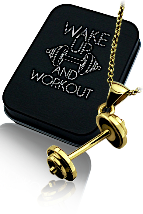 Zlatý přívěsek, fitness činka s řetízkem a krabičkou.