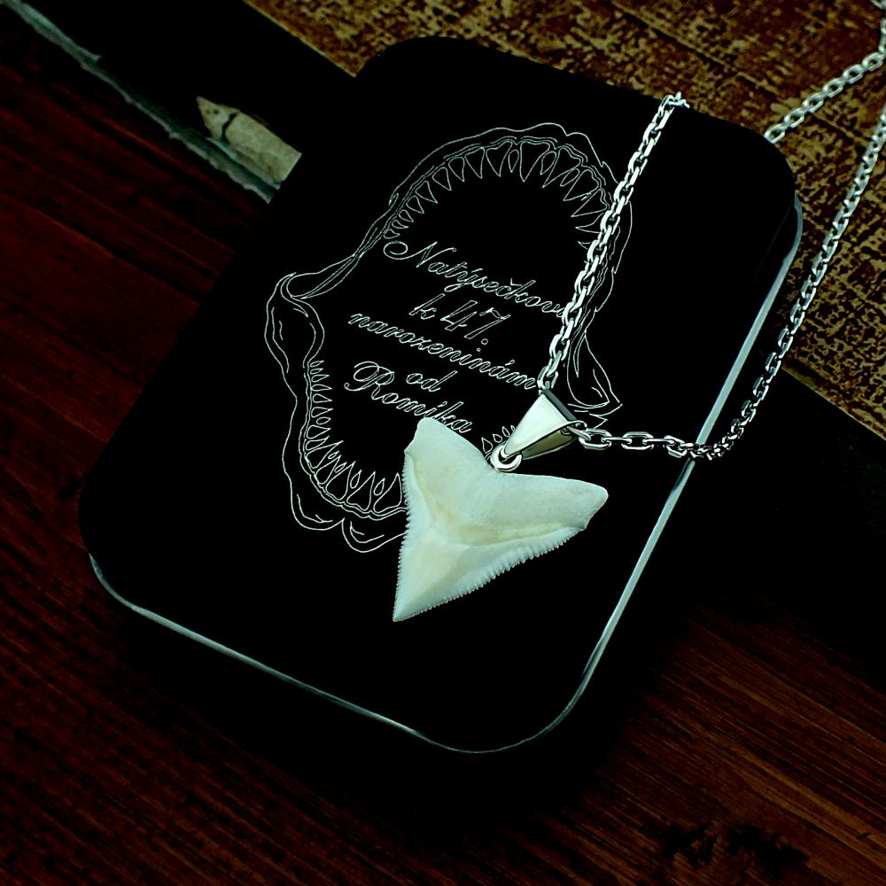 Stříbrný přívěsek ryzosti 925/1000 v lesklé povrchové úpravě a zdobený raločím zubem. Zub raloka bělavého pochází z horní, nebo střední části čelisti a jeho velikost je přiblině 2cm. Jedná se o pravý zub raloka bělavého proto se mohou jednotlivé rozměry mírně liit. Závěsné očko na řetízek je vyrobeno ze stŕíbra. Zapínaní řetízku je na pérový krouek a délka je 50cm. V ceně náhrdelníku je ji zahrnuta dárková krabička, na kterou můeme vyrýt delí věnování. Poadované rytí na krabičku popřípadě jinou délku řetízku nám napite do poznámky v objednávce (třetí krok objednávky v koíku).