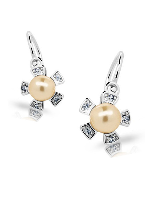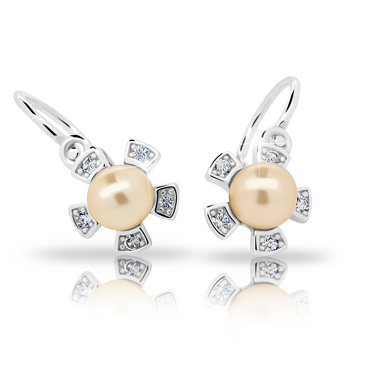 Dětské náušnice jsou vyrobeny ze stříbra ryzosti 925/000 a jsou rhodiované. Naušnice jsou vhodné pro děti od nejmenších miminek až po školáky. Dětské naušnice jsou ozdobeny perlou a zirkony. Stříbrné náušnice jsou vhodnou náhradou za zlaté náušnice tam, kde zlato v ouškách černá. Dopřejte svému dítěti kvalitní náušnice české výroby.