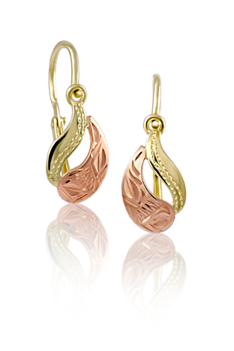 Dětské náušnice jsou vyrobeny ze žlutého zlata ryzosti 585/1000 v lesklé povrchové úpravé. Dětské náušničky jsou zdobené ručně rytémi lístky. Naušnice jsou vhodné pro děti od nejmenších miminek až po školáky. Náušnice se zapínají ze předu na tzv. dětskou brizuru a skvěle drží i v drobných ouškách děvčátek a miminek.