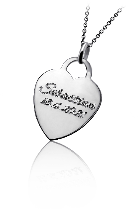 Přívěsek srdíčko vyrobený ze stříbra a zdobený vlastním rytím. Rytí písmena, iniciálu nebo věnování je už v ceně přívěsku a mužete si zvolit lesklé rytí nebo černé. Požadovanou rytinu nám napište do poznámky v objednávce (třetí krok v košíku). K přívěsku už je zahrnuta krabička na kterou můžeme vyrýt delši text.