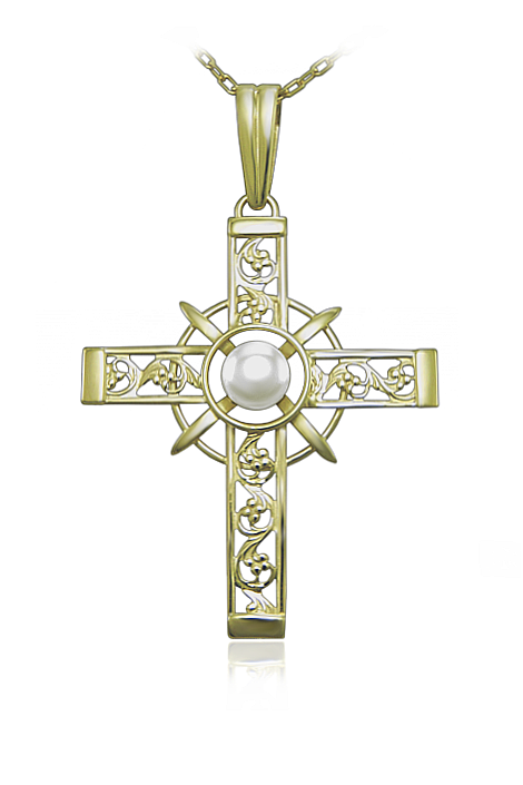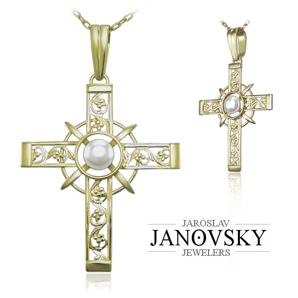 Přívěsek křížek vyrobený ze žlutého zlata ryzosti 585/1000. Kříž je vyrobený lisováním a zdobený perlou. Díky tomu je přívěsek lehký a příjemně se nosí. K přívěsku už je zahrnuta krabička na kterou mužeme vyrýt delši text. Do poznámky v objednávce nám jen napište jaké budete chtít rýtí ( třetí krok v košíku ).