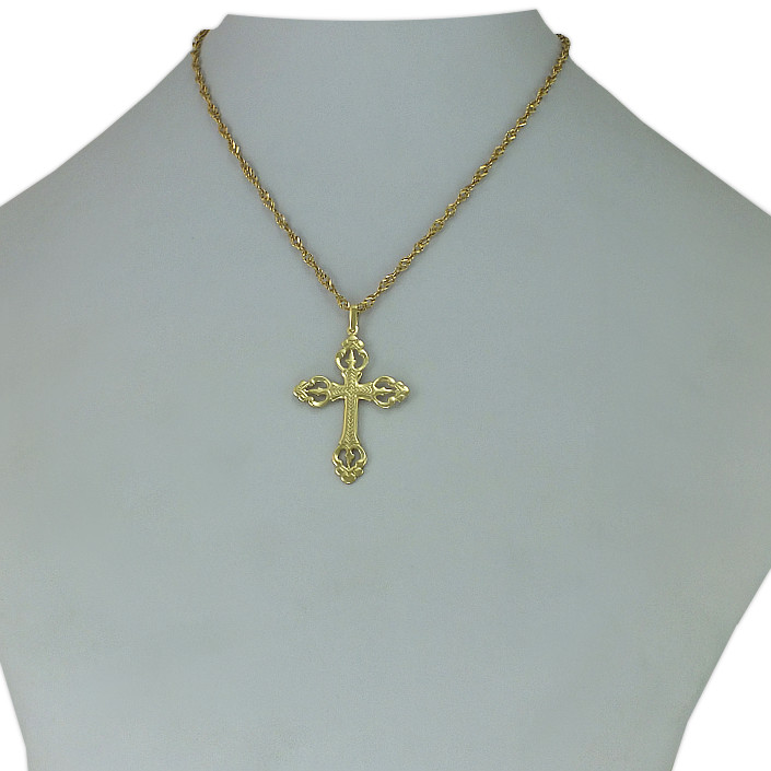 Přívěsek křížek vyrobený ze žlutého zlata ryzosti 585/1000. Křížek je možné nechat vyrobit i z bílého zlata, popřípadě i ze stříbra. K přívěsku už je zahrnuta krabička na kterou mužeme vyrýt delši věnování. Do poznámky v objednávce nám jen napište jaké budete chtít rýtí ( třetí krok v košíku ).