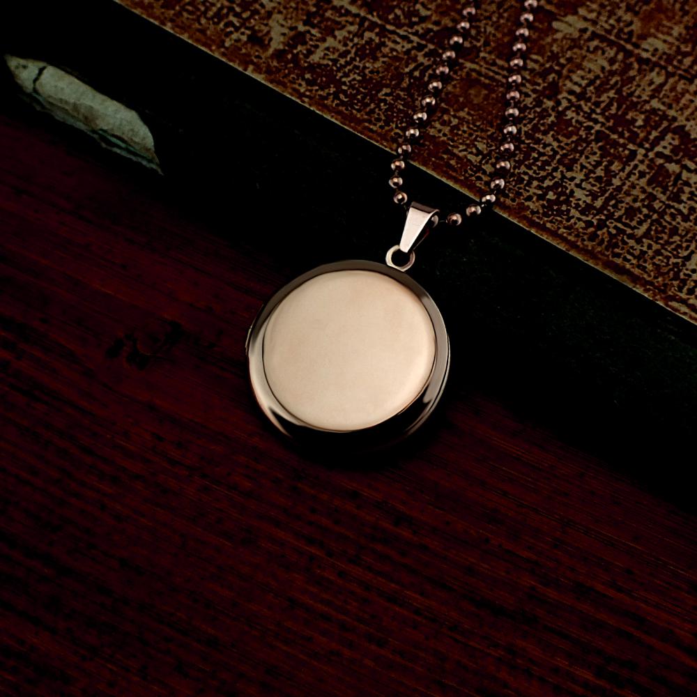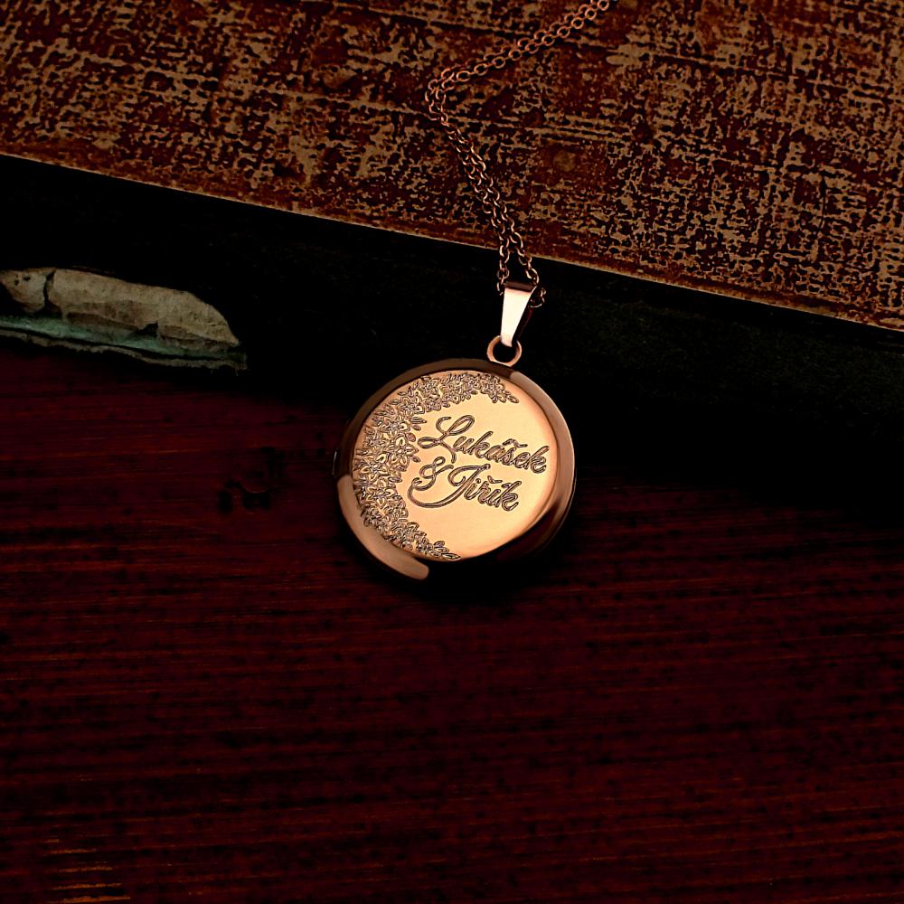 Přívěsek ve tvaru kolečka je vyrobený z oceli a pozlacen v růžové barvě. Do otevíracího medailonku lze vložit dvě fotografie které vám rádi do přívěsku vložíme). Na zadní stranu se vejde krátké věnování (miluji tě,k narozeninám,od babičky...). Rytí písmenka nebo věnování je už v ceně ocelového přívěsku. Do poznámky v objednávce nám jen napište jaké budete chtít rýtí (třetí krok v košíku). Pokud budete chtít vložit vaše fotografie do medailonku, pošlete nám je emailem s číslem vaší objednávky.