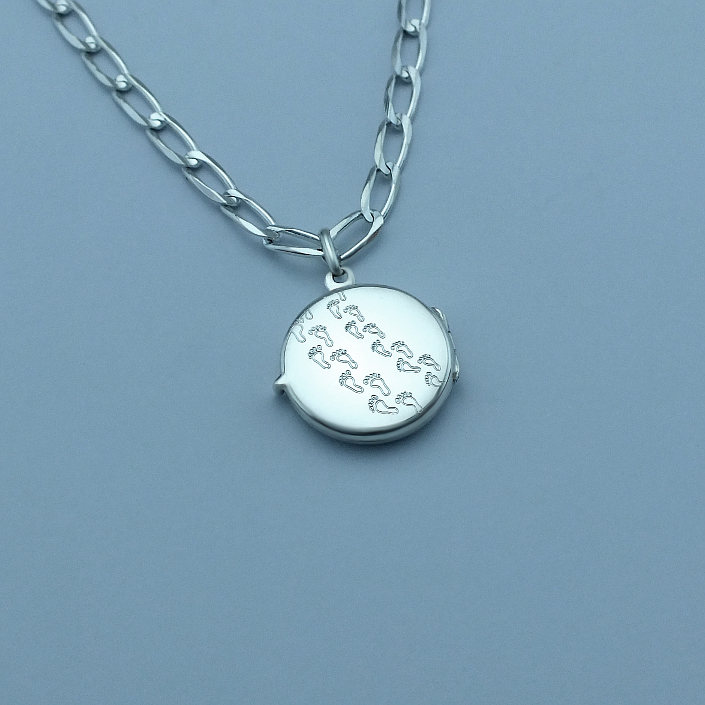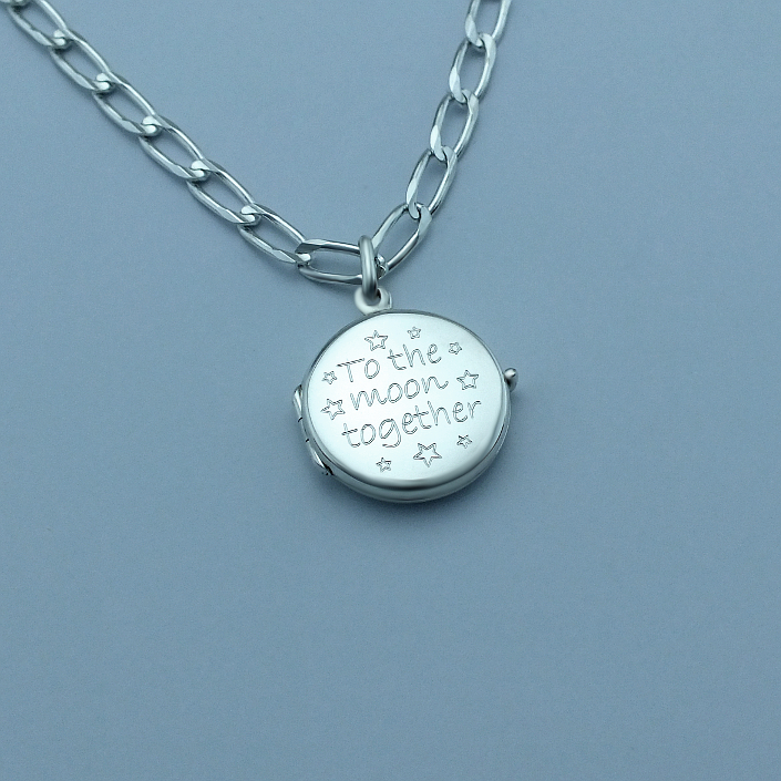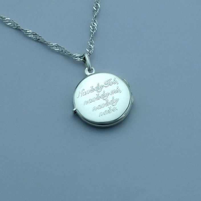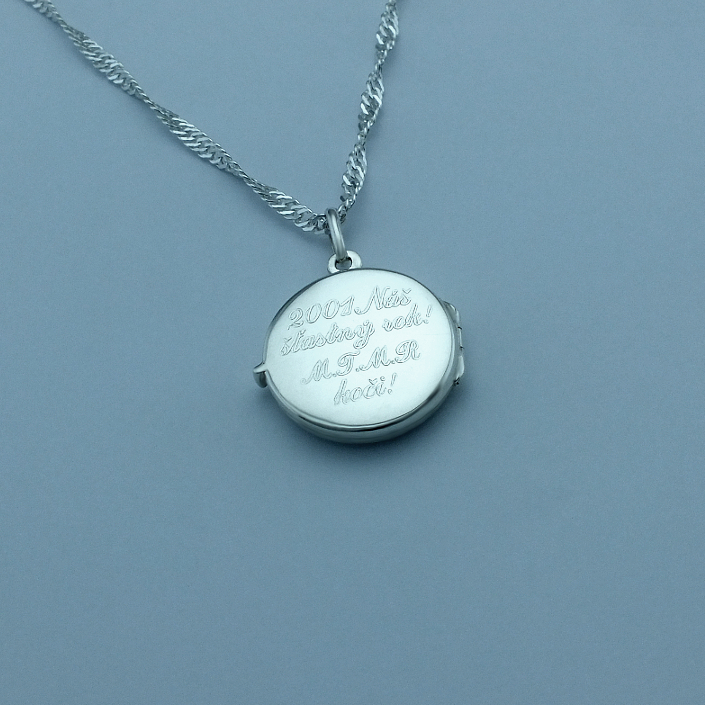 Stříbrný přívěsek, otevírací medailonek ve tvaru kolečka. Přívěsek je vyrobený ze stříbra ryzosti 925/1000 v lesklé povrchové úpravě. Rytí na medailonek je zcela na vás, na fotografii je pouze ilustrativní vzor. Na zadní stranu můžeme vyrýt další text dle vašeho přání. Veškeré rytí na otevírací medailon je už zahrnuto v ceně přívěsku. Požadovanou rytinu nám napište do poznámky v objednávce (třetí krok v košíku). Pokud budete chtít vložit vaše fotografie do medailonku, pošlete nám je emailem s číslem vaší objednávky.