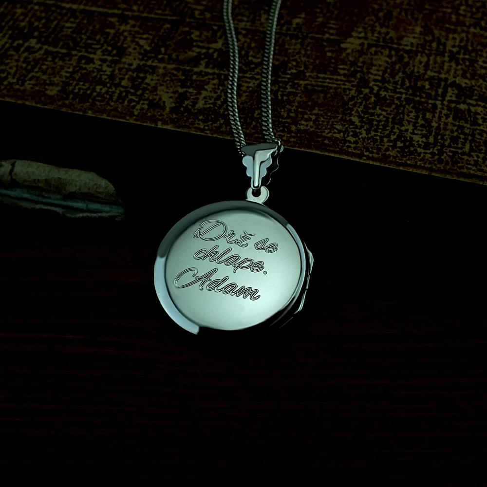 Stříbrný přívěsek, otevírací medailonek ve tvaru kolečka s rytým motivem. Přívěsek je vyrobený ze stříbra ryzosti 925/1000 v lesklé povrchové úpravě. Rytí vzoru na medailonek je zcela na vás, na fotografii je pouze ilustrativní vzor (na přední stranu lze vyrýt upravena fotka nebo text). Na zadní stranu můžeme vyrýt krátké věnování ( miluji tě, k narozeninám, od babičky). Veškeré rytí na otevírací medailonek je už zahrnuto v ceně přívěsku. Požadovanou rytinu nám napište do poznámky v objednávce (třetí krok v košíku). Pokud budete chtít vložit vaše fotografie do medailonku, pošlete nám je emailem s číslem vaší objednávky.