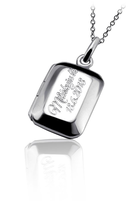 Stříbrný přívěsek, otevírací medailonek ve tvaru obdelníku. Přívěsek je vyrobený ze stříbra ryzosti 925/1000 v lesklé povrchové úpravě. Rytí na medailonek je zcela na vás, na fotografii je pouze ilustrativní vzor. Na zadní stranu můžeme vyrýt další text dle vašeho přání. Veškeré rytí na otevírací medailon je už zahrnuto v ceně přívěsku. Požadovanou rytinu nám napište do poznámky v objednávce (třetí krok v košíku). Pokud budete chtít vložit vaše fotografie do medailonku, pošlete nám je emailem s číslem vaší objednávky.