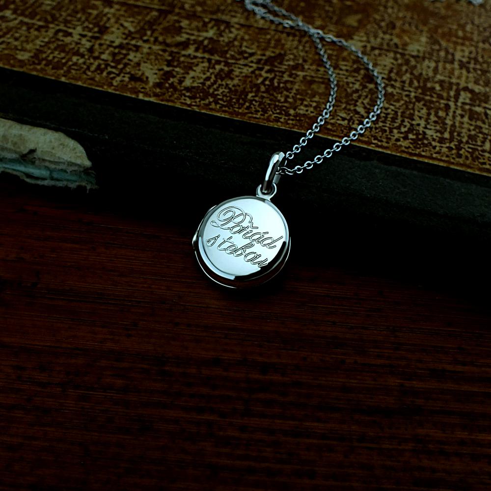 Přívěsek ve tvaru kolečka je vyrobený ze stříbra ryzosti 925/1000. Do otevíracího medailonku lze vložit dvě fotografie o rozměru 15mm (fotografie vám rádi do přívěsku vložíme). Na zadní stranu se vejde krátké věnování (miluji tě,k narozeninám,od babičky...). Rytí písmenka a věnování je už v ceně přívěsku. Do poznámky v objednávce nám jen napište jaké budete chtít rýtí (třetí krok v košíku). Pokud budete chtít vložit vaše fotografie do medailonku, pošlete nám je emailem s číslem vaší objednávky.