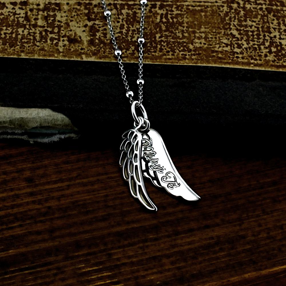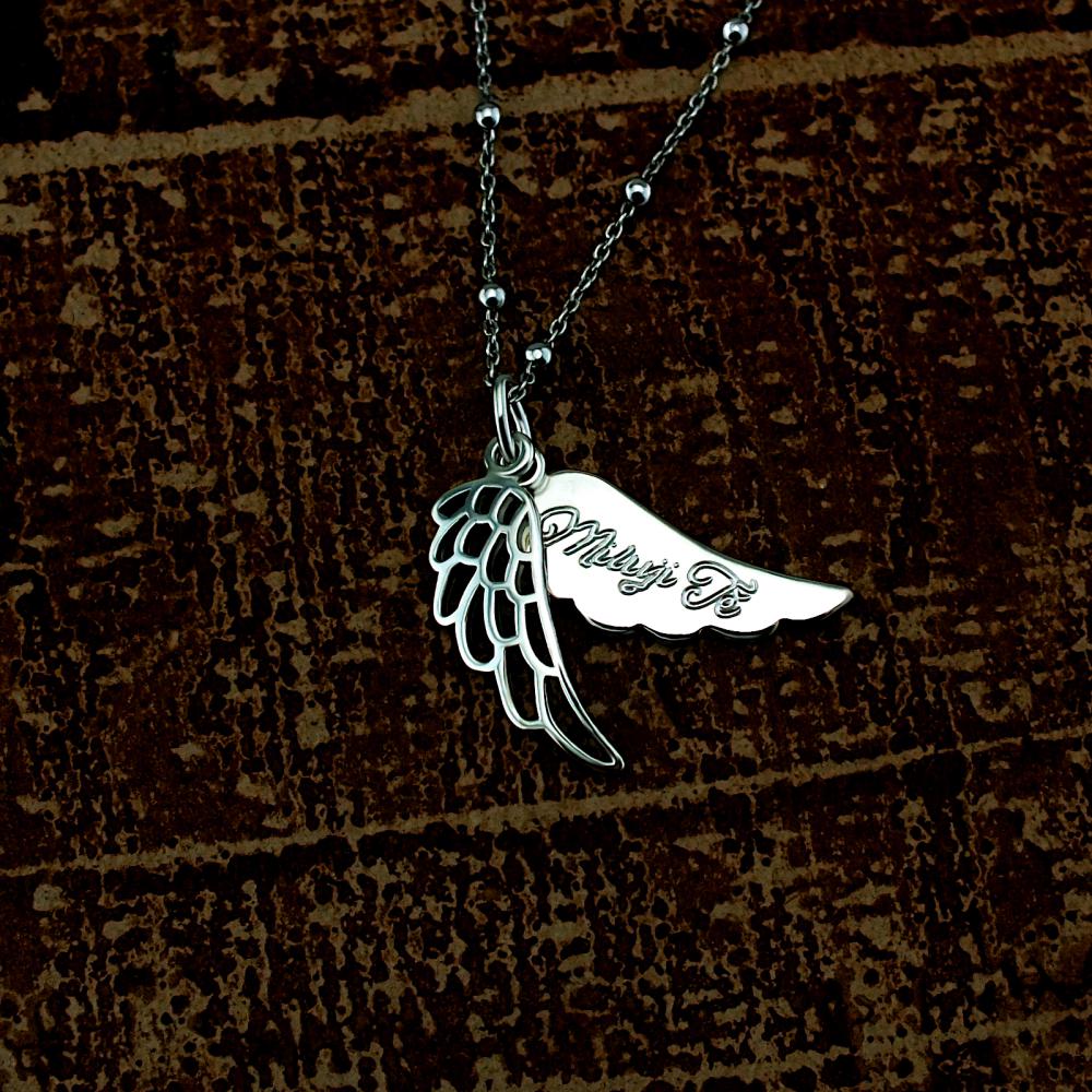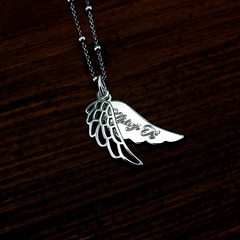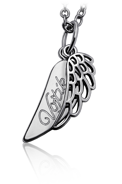 Přívěsek je vyrobený ze stříbra ryzoti 925/1000 v lesklé povrchové úpravě zdobený andělským křídlem. Rytí na spodní křídlo je zcela na vás, na fotografii je pouze ilustrativní vzor. Přívěsek je navlačen na stříbrný řetízek v délce 45cm a zasílán v krabičce na které je možné vyrýt vaše věnování. Veškeré rytí na andělské křídlo a krabičku je už zahrnuto v ceně přívěsku. Požadovanou rytinu nám napište do poznámky v objednávce (třetí krok v košíku).