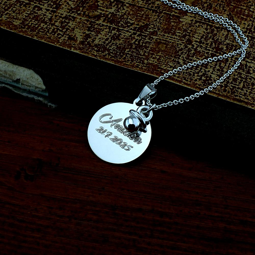 Řetízek a kolečko jsou vyrobené ze stříbra v lesklé povrchové úpravě. Rytí na přívěsek je zcela na vás, na fotografii je pouze ilustrativní vzor. Veškeré rytí na destičku je už zahrnuto v ceně náhrdelníku. Požadovanou rytinu nám napište do poznámky v objednávce (třetí krok v košíku). Zapínaní je na péroví kroužek a délka řetízku je 50 cm (vhodná i pro muže), pokud budete chtít jinou délku napište nám o ni do poznámky v objednávce.