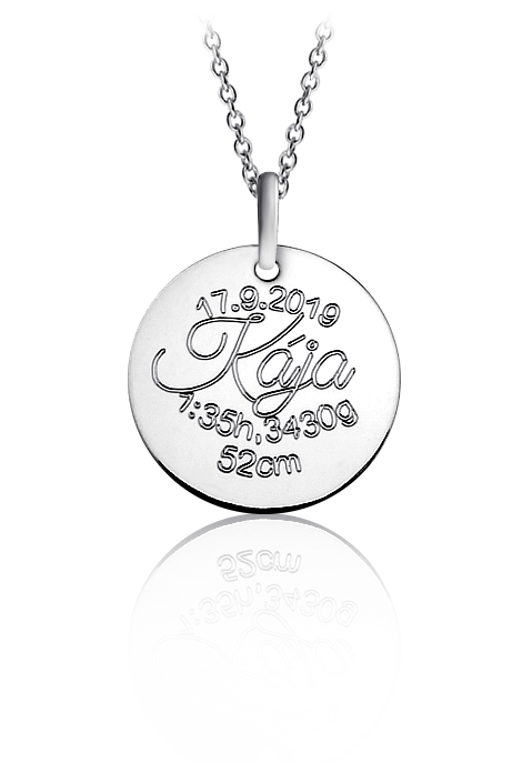 Přívěsek ve tvaru kolečka je vyrobený ze stříbra ryzosti 925/1000 a zdobený rytím z jedné strany. Na přední stranu medailonku lze vyrýt písmenko nebo věnování. Stříbrné kolečko s věnováním je už včetně řetízku v délce 50cm. K přívěsku už je zahrnuta dárková krabička na kterou můžeme vyrýt delší věnování. Do poznámky v objednávce nám napište jaké budete chtít rýtí (třetí krok v košíku).