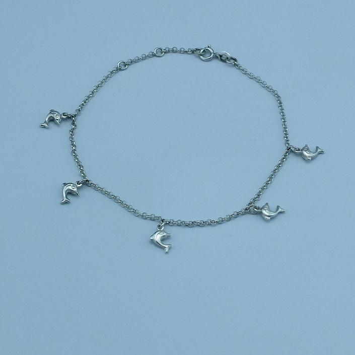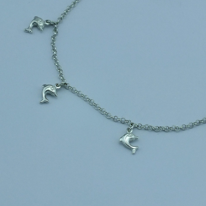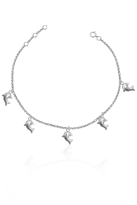 Dámský stříbrný náramek na nohu zdobený delfíny. Náramek na nohu je vyroben ze stříbra ryzosti 925/1000 v lesklé povrchové úpravě. Délka dámského náramku s delfínky je 25cm a zapínání se může libovolně posunovat.