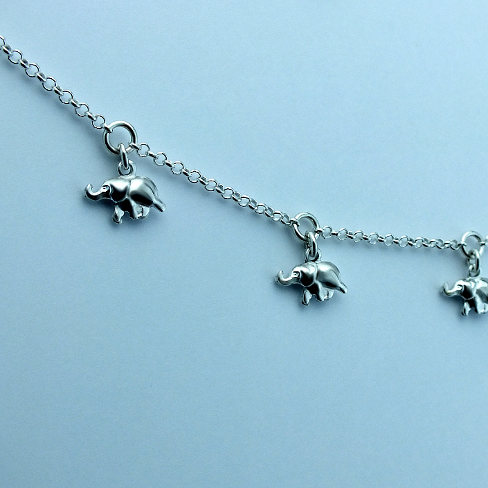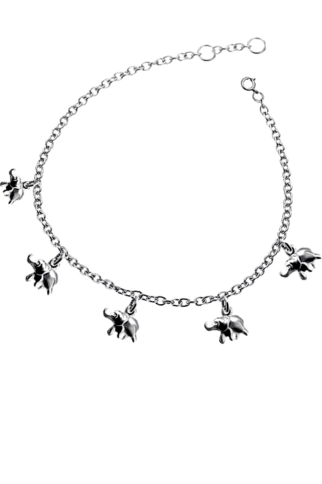 Dámský stříbrný náramek na nohu ryzosti 925/1000 v lesklé povrchové úpravě zdobený slony. Délka náramku je 25cm a zapínání u náramku lze posouvat. K náramku je zahrnuta dárková krabička na kterou vám můžeme vyrýt věnování.Do poznámky v objednávce nám jen napište jaké budete chtít rytí ( třetí krok v košíku).