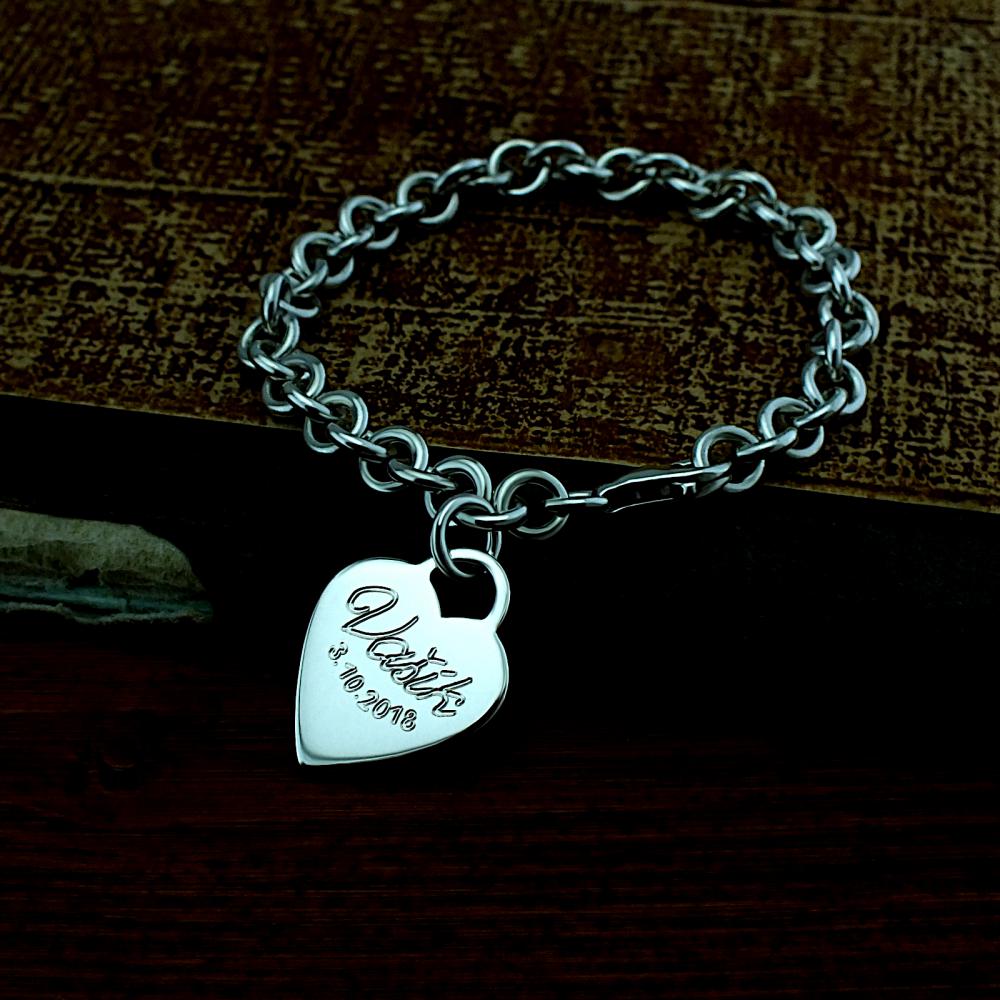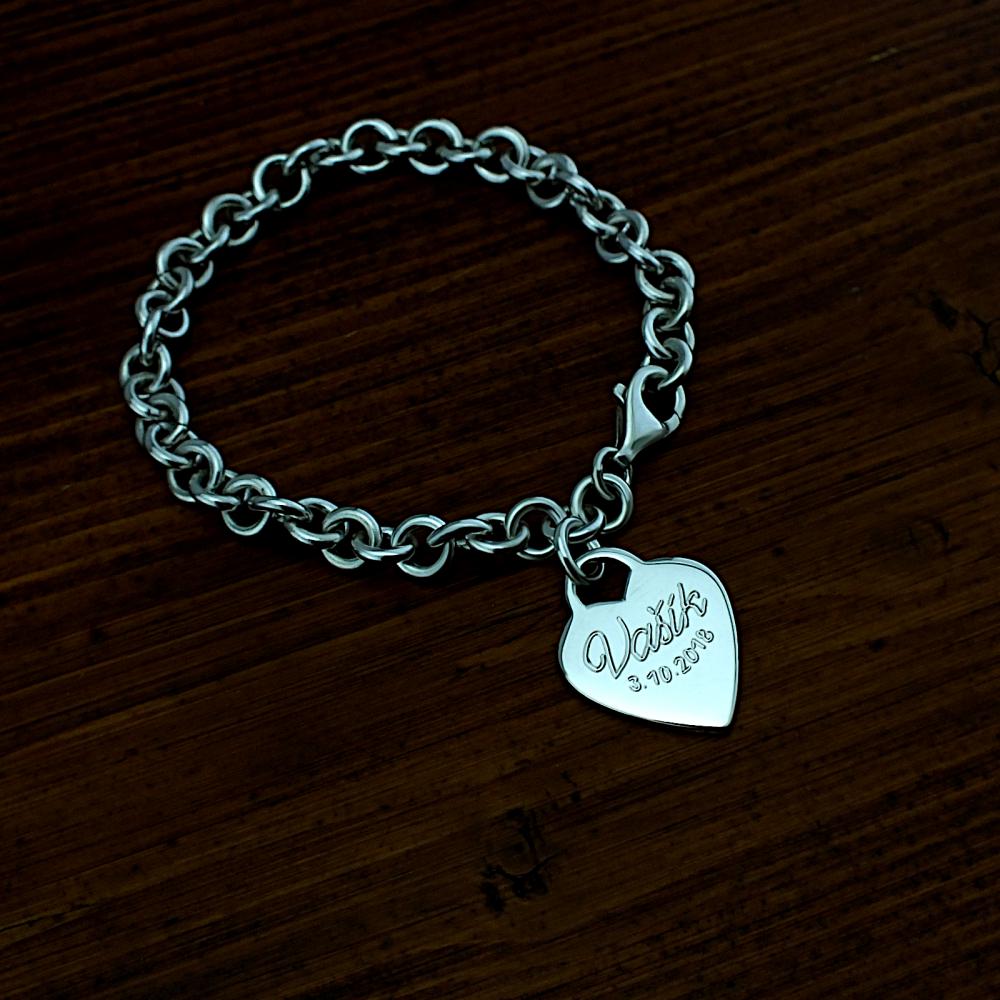 Dámský stříbrný náramek zdobený srdíčkem. Na přívěsek je možné nechat vyrýt věnování a to z obou stran. Cena náramku je včetně rytí. Náramek vyrábíme ve všech velikostech (běžná délka je 18 cm). Velikost a požadované rytí nám napište do poznámky v objednávce (třetí krok v košíku). K náramku už je zahrnuta krabička na kterou můžeme vyrýt delši text.