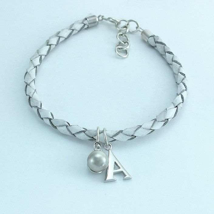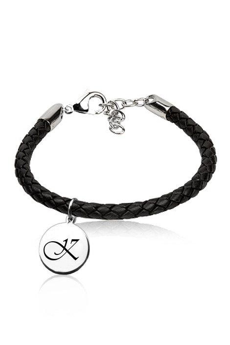 Náramek je vyroben z černé pletené kůže a zdoben stříbrným kolečkem. Na přívěsek lze vyrýt písmenko nebo krátký text a to z obou stran (rytí už je v ceně). Požadovaný text nám napište do poznámky v obědnávce.