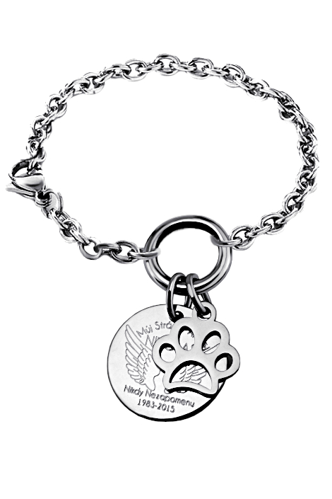 Ocelový náramek zdobený psí tlapkou a kolečkem v leklé povrchové upravě. Na přívěsek je možné nechat vyrýt věnování a to z obou stran. Cena náramku je včetně rytí. Náramek vyrábíme ve všech velikostech (běžná délka je 18 cm). Velikost a požadované rytí nám napište do poznámky v objednávce (třetí krok v košíku). K náramku už je zahrnuta krabička na kterou můžeme vyrýt delší text.