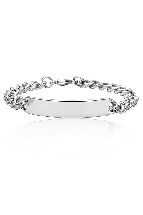 Pánský stříbrný náramek vzor figaro. Na hladkou destičku lze vyrýt jméno,datum narození nebo krevní skupinu (rytí už je v ceně,do poznámky v obědnávce nám jen napište jaké budete chtít). Šířka náramku i destičky je 11 mm. Délka náramku je 20 cm (běžná pánská velikost).