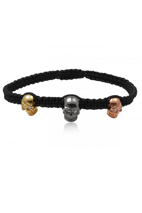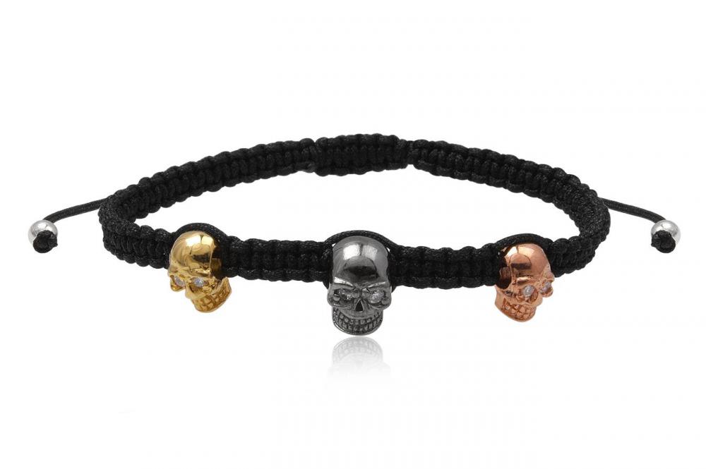 Pánský náramek pletený z hedvábí černé barvy. Po obvodu je náramek zdoben stříbrnými lebkami. Lebky jsou zlaceny do tŕí barev. Zapínání a délka řemínku je univerzální.