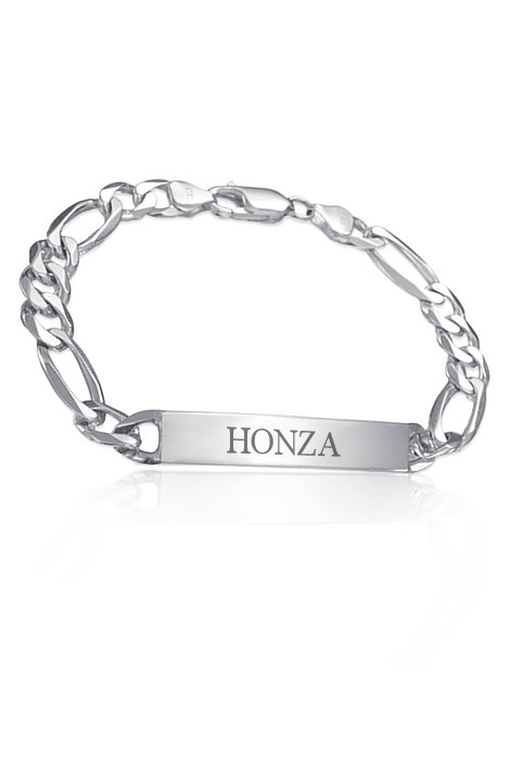 Pánský stříbrný náramek vzor figaro. Na hladkou destičku lze vyrýt jméno,datum narození nebo krevní skupinu (rytí už je v ceně,do poznámky v obědnávce nám jen napište jaké budete chtít). Šířka náramku i destičky je 9 mm. Délka náramku je 20 cm (běžná pánská velikost).