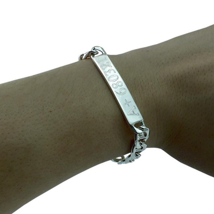 Na hladkou destičku lze vyrýt jméno, datum narození nebo krevní skupinu (rytí už je v ceně náramku).