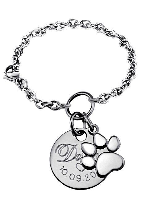 Stříbrný náramek zdobený psí tlapkou a kolečkem v leklé povrchové upravě. Na přívěsek je možné nechat vyrýt věnování a to z obou stran. Cena náramku je včetně rytí. Náramek vyrábíme ve všech velikostech (běžná délka je 18 cm). Velikost a požadované rytí nám napište do poznámky v objednávce (třetí krok v košíku). K náramku už je zahrnuta krabička na kterou můžeme vyrýt delší text.