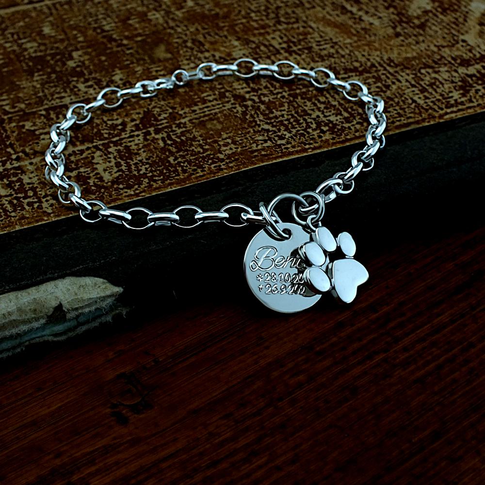 Stříbrný náramek zdobený psí tlapkou a kolečkem v leklé povrchové upravě. Na přívěsek je možné nechat vyrýt věnování a to z obou stran. Cena náramku je včetně rytí. Náramek vyrábíme ve všech velikostech (běžná délka je 18 cm). Velikost a požadované rytí nám napište do poznámky v objednávce (třetí krok v košíku). K náramku už je zahrnuta krabička na kterou můžeme vyrýt delší text.