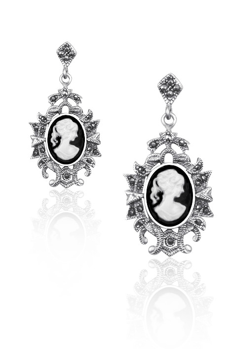 Dámské náušnice jsou vyrobeny ze střibra a zdobeny kamejí a markazity. Naušnice mají starostříbrnou patinu.
