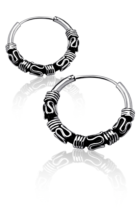 Stříbrné náušnice ve tvaru kruhu v patinované povrchové úpravě.
