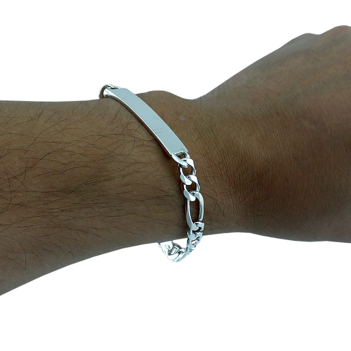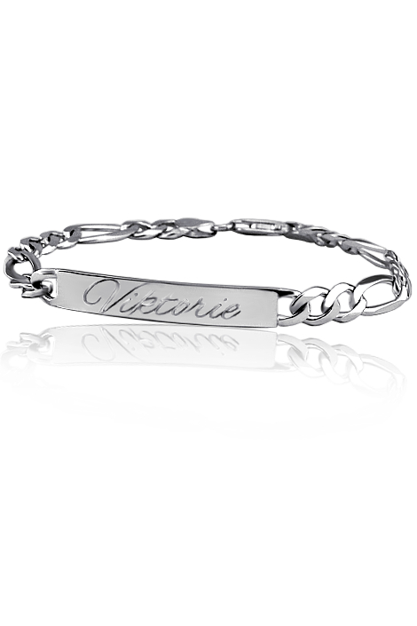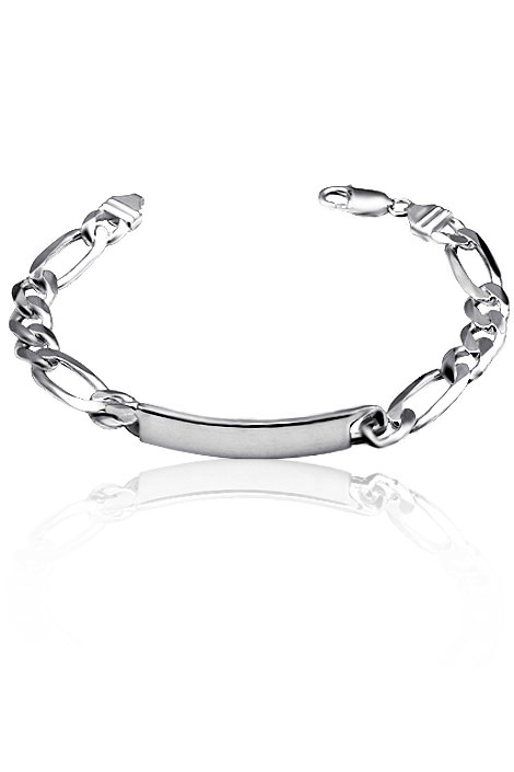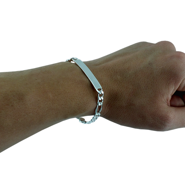 Pánský stříbrný náramek vzor figaro v lesklé povrchové úpravě. Na hladkou destičku lze vyrýt jméno, datum narození nebo krevní skupinu (rytí už je v ceně náramku). Šířka náramku i destičky je 6mm a tloušťka 1mm. Délka náramku je 20 cm (běžná pánská velikost). Do poznámky v objednávce nám napište jaké budete chtít rytí (třetí krok v košíku).