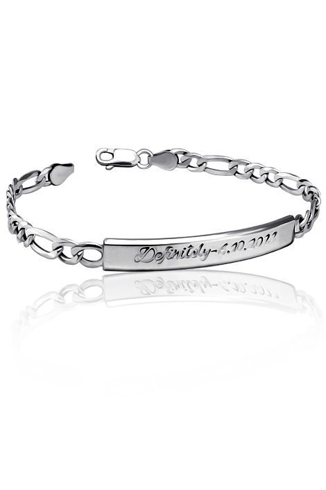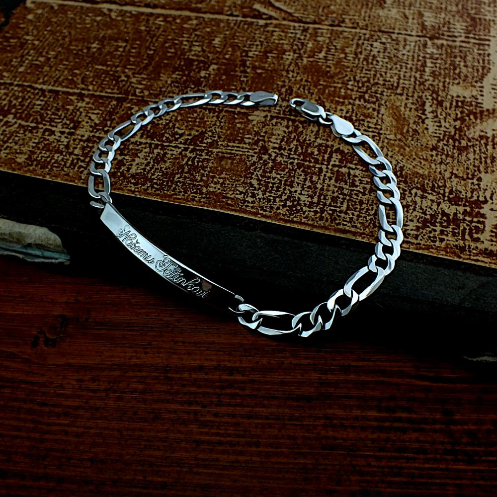 Pánský stříbrný náramek vzor figaro, vyrobený ze stříbra ryzosti 925/1000 v lesklé povrchové úpravě. Na hladkou destičku lze vyrýt jméno,datum narození nebo krevní skupinu. Šířka náramku i destičky je 6mm a tloušťka 1mm. Délka náramku je 20 cm (běžná pánská velikost). Rytí už je v ceně náramku a do poznámky v objednávce nám jen napište jaké budete chtít rytí (třetí krok v košíku).