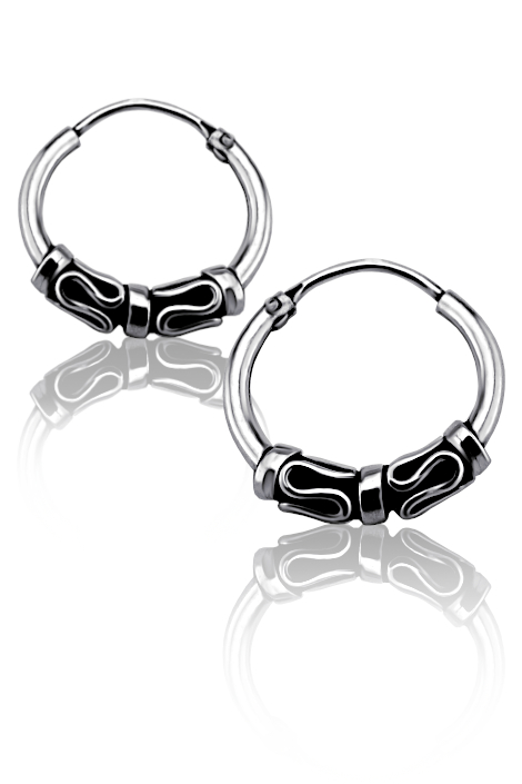 Stříbrné náušnice ve tvaru kruhu v patinované povrchové úpravě.