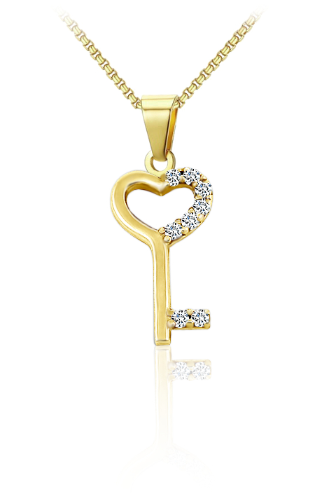 Přívěsek ve tvaru klíčku je vyroben ze žlutého zlata ryzosti 585/1000 v lesklé povrchové úpravě. Detailně propracovaný klíček kde je střed ve tvaru srdíčka a po boku zdobený zirkony. Přívěsek klíčku je možné vyrobit i z bílého zlata.