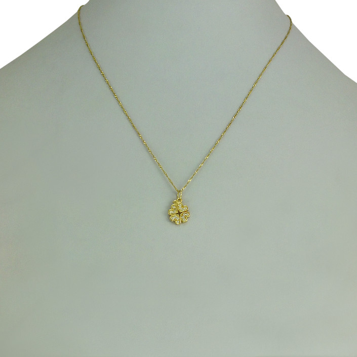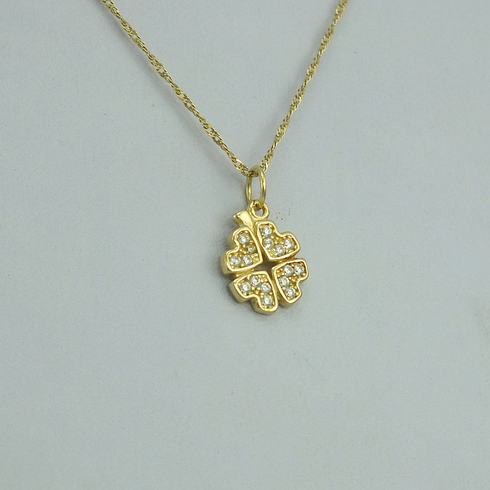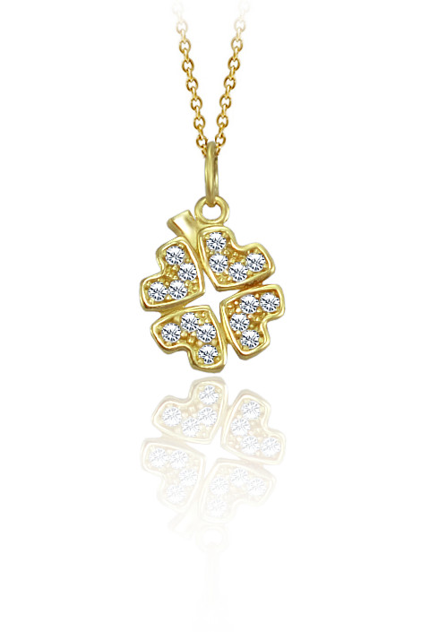 Zlatý přívěsek vyrobený ze žlutého zlata ryzosti 585/1000. Čtyřlístek je zdobený zirkony bílé barvy. K přívěsku už je zahrnuta krabička na kterou můžeme vyrýt delši text. Do poznámky v obědnávce nám jen napište jaké budete chtít rýtí.