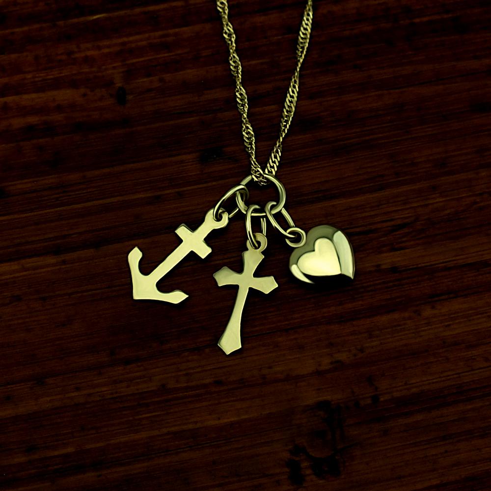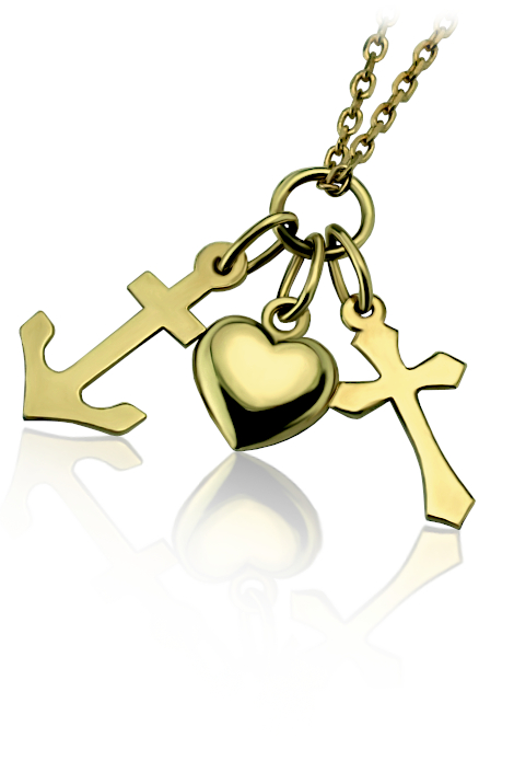 Zlatý přivěsek zdobený srdíčkem, křížkem a kotvou.