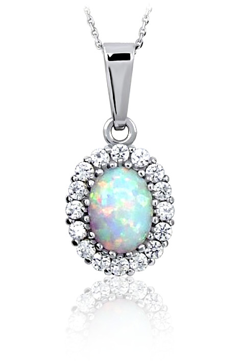 Dámský přívěsek vyrobený z bílého zlata ryzosti 585/1000 v lesklé povrchové úpravě. Zlatý přívěsek je zdoben opálem a zirkony (kameny jsou sintetiské). K přívěsku už je zahrnuta dárková krabička na kterou mužeme vyrýt vaše věnování. Do poznámky v objednávce nám jen napište jaké budete chtít rýtí ( třetí krok v košíku ).