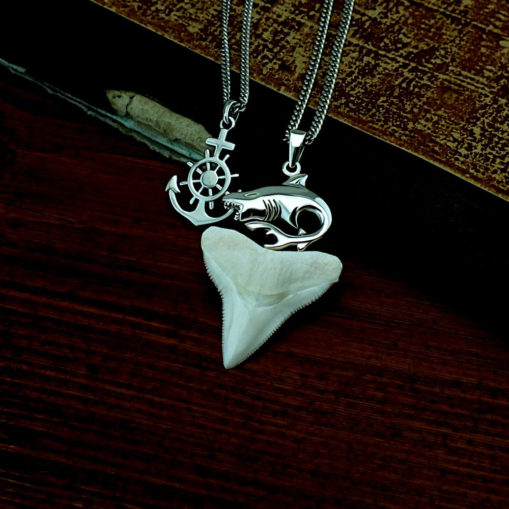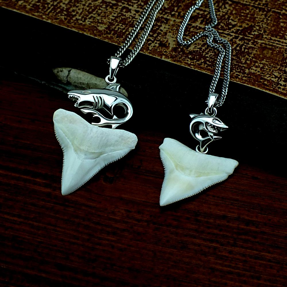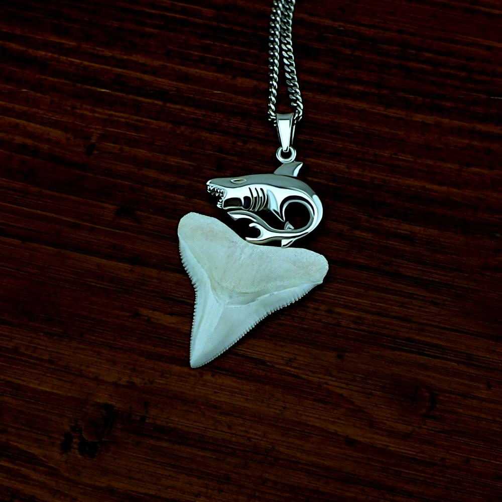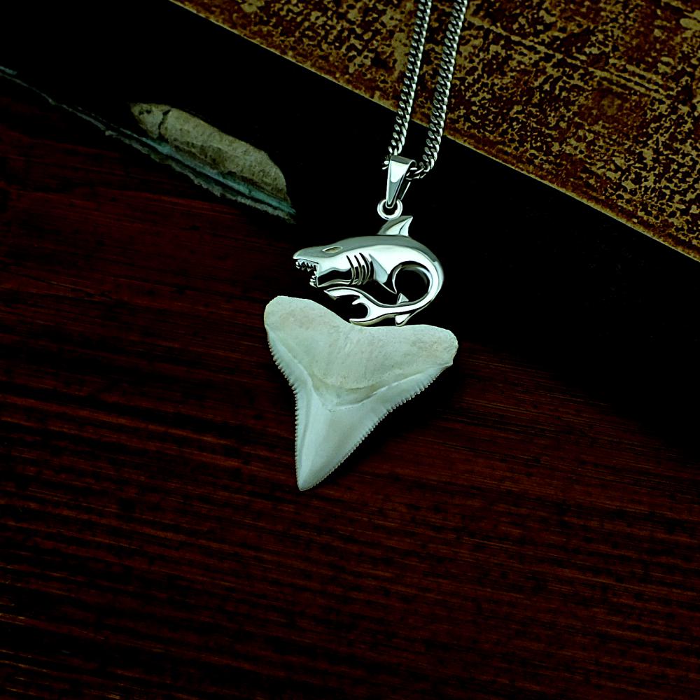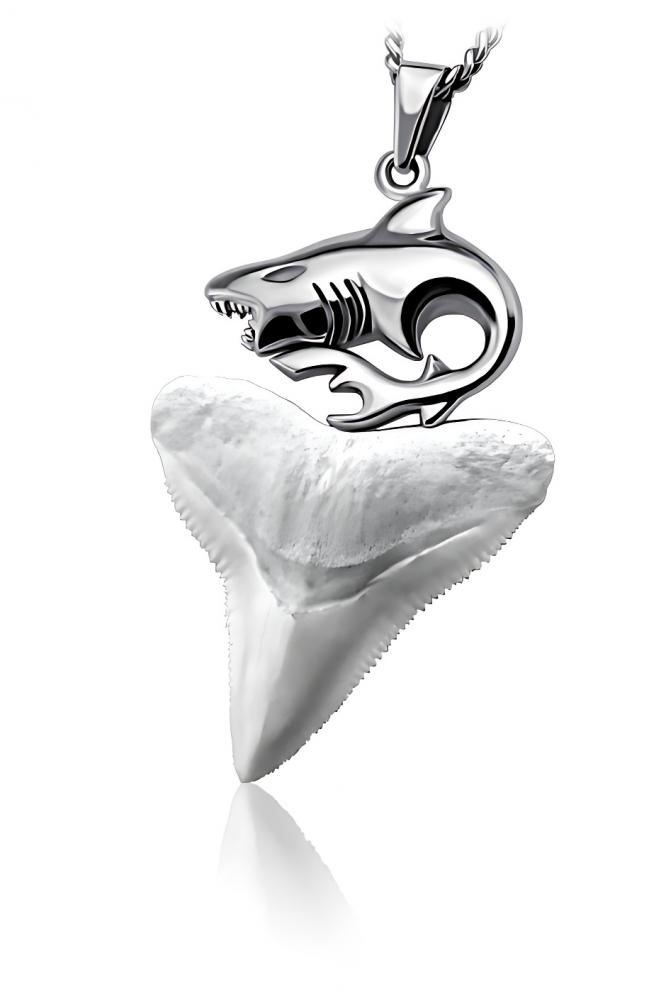 Stříbrný přívěsek raloka ryzosti 925/1000 v lesklé povrchové úpravě a zdobený raločím zubem. Zub raloka bělavého pochází z horní, nebo střední části čelisti a jeho velikost je přiblině 25mm. Jedná se o pravý zub raloka bělavého proto se mohou jednotlivé rozměry mírně liit. Závěsné očko a ozdobný ralok jsou vyrobeny ze stŕíbra.