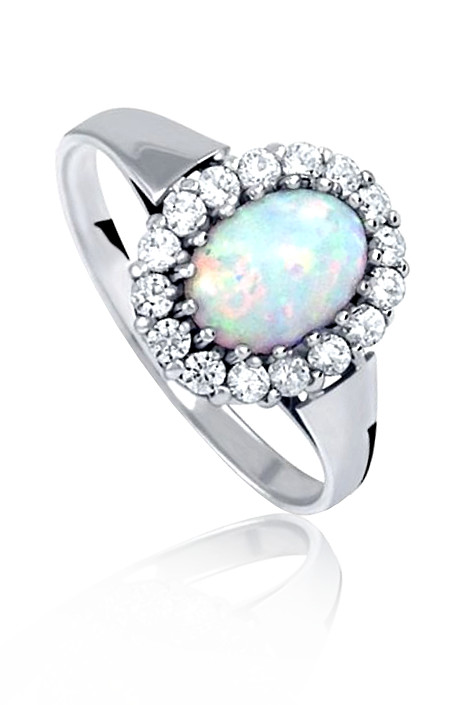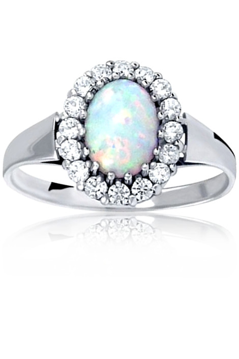 Dámský prsten z bíleho zlata ryzosti 585/1000 v lesklé povrchové úpravě. Zdobený opálem a zirkony po obvodu. Prsten vyrábíme ve všech velikostech. Požadovanou velikost nám napište do poznámky v objednávce ( třetí krok v košíku ).