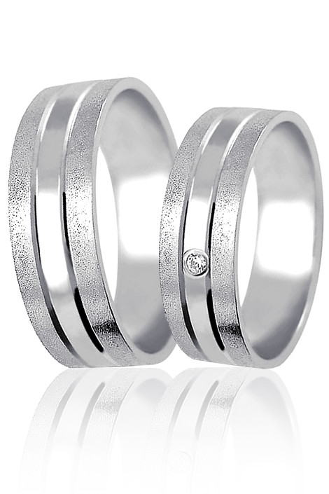 Snubní prsteny z bílého zlata, zdobené jedním zirkonem nebo briliantem. Matná a lesklá povrchová uprava. Šířka prstenu je 6mm. Cena obou prstenů je udávána ve velikosti 58 (dámský) a 60 (pánský). Velikost prstenu a rytí dovnitřku obroučky nám napište do poznámky v objednávce.