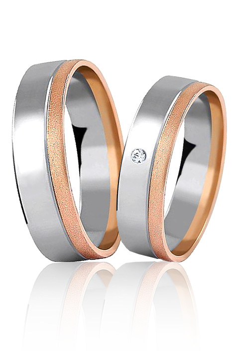 Snubní prsteny z bílého a červeného zlata. Zdobený jedním zirkonem nebo briliantem. Matná povrchová uprava u červeného zlata a lesklá u bílého.Šířka prstenu je 5mm. Cena obou prstenů je udávána ve velikosti 58 (dámský) a 60 (pánský). Velikost prstenu a rytí dovnitřku obroučky nám napište do poznámky v objednávce.