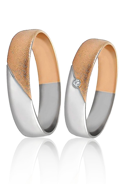 Snubní prsteny z bílého a červeného zlata. Zdobený jedním zirkonem nebo briliantem. Matná povrchová uprava u červeného zlata a lesklá u bílého.Šířka prstenu je 4,8mm. Cena obou prstenů je udávána ve velikosti 58 (dámský) a 60 (pánský). Velikost prstenu a rytí dovnitřku obroučky nám napište do poznámky v objednávce.