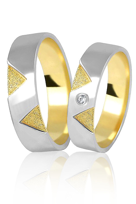 Snubní prsteny z bílého a lutého zlata. Zdobený jedním zirkonem nebo briliantem. Matná povrchová uprava u lutého zlata a lesklá u bílého.ířka prstenu je 6mm. Cena obou prstenů je udávána ve velikosti 58 (dámský) a 60 (pánský). Velikost prstenu a rytí dovnitřku obroučky nám napite do poznámky v objednávce.