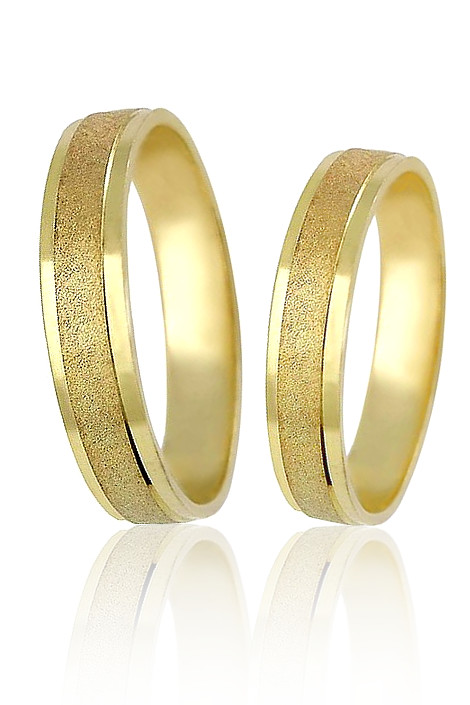Snubní prsteny ze lutého zlata zdobené matným středem. Matná povrchová uprava u lutého zlata dodává prstenu moderní vzhled. ířka prstenu je 4mm. Cena obou prstenů je udávána ve velikosti 58 (dámský) a 60 (pánský). Velikost prstenu a rytí dovnitřku obroučky nám napite do poznámky v objednávce.