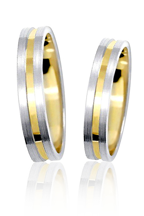 Snubní prsteny ze žlutého a bílého zlata. Matná povrchová uprava u bílého a lesklá u žluého zlata dodává prstenu moderní vzhled. Šířka prstenu je 3,7mm. Cena obou prstenů je udávána ve velikosti 58 (dámský) a 60 (pánský). Velikost prstenu a rytí dovnitřku obroučky nám napište do poznámky v objednávce.